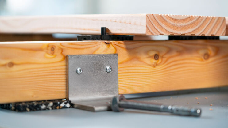 Damit Regenwasser schneller ablaufen kann und sich keine Staunässe bildet, sollten die Tragbalken der Unterkonstruktion ein Gefälle von ein bis zwei Prozent in Laufrichtung der Dielen aufweisen. Ein weiterer wichtiger Punkt ist der Abstand zwischen den Fugen des Terrassenbelags. Dadurch ist gewährleistet, dass eine Luftzirkulation möglich ist. Das heißt, wenn Feuchtigkeit ans Holz kommt, kann diese schnellstmöglich wieder trocknen. Einen einheitlichen Abstand zwischen den Fugen bekommen Sie übrigens am besten mit einem Abstandshalter hin.